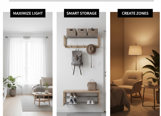 Even in a studio apartment, create visual zones—like a reading nook, dining corner, or work desk. Rugs or low dividers can subtly separate these areas without walls.